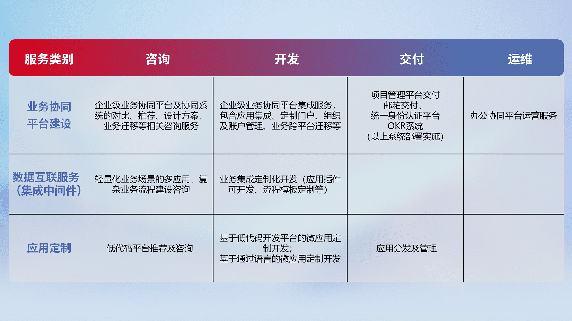 针对钉钉、、、、企微、、IDaas等平台级产品提供产品的规划、、方案、、交付、、定制化开发等服务,,,实现如统一协同办公、、、智能客户服务、、、、混合会议管理、、、、智能数据查询、、、等业务场景,,,,实现数字化转型。。