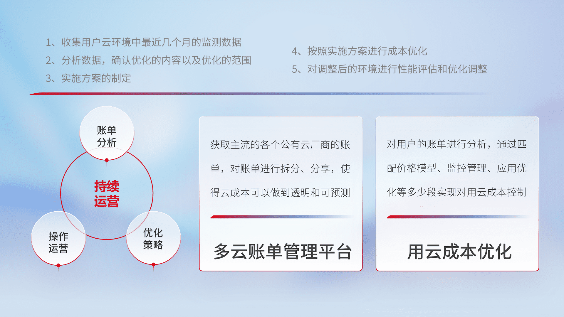通过多云纳管,,以统一的资源数据模型把客户的云资源进行抽象和封装,,进而实现对多云资源的统一操作,,保障云资源管理的可靠性、、、、稳定性与可用性。。。量身定制化运维内容,,配置、、、、开发运维、、、、补丁管理、、、备份、、监控、、认证和访问管理、、、、审计和日常巡检等,,保障在用云过程中的可靠度,,,,稳定度以及高可用率。。。。